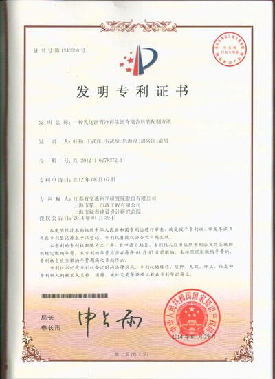 1月29日,由我公司自主研发的“乳化沥青冷再生沥青混合料的配制方法”通过国家知识产权局审查,被授予国家发明专利证书。  目前工程界常用的乳化沥青冷再生沥青混合料配制方法,对最佳含水率、最佳乳化沥青用量的试验偏简单,且缺乏一定的检验方法,而且在确定乳化沥青最佳用量过程中所采用的实验方法,不符合实际生产情况。  我公司发明的乳化沥青冷再生沥青混合料...