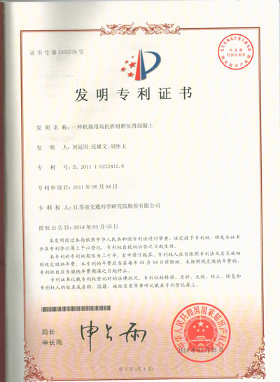 近日,由我公司自主研发的“一种机场用高抗折耐磨抗滑混凝土”及“波形钢板与混凝土的抗剪连接件”通过国家知识产权局审查,被授予发明专利证书,截止目前,已获得授权专利108项。  “机场用高抗折耐磨抗滑混凝土”是我公司研发的一种土木工程领域混凝土材料的新配方,可完善机场道面的使用性能,提高安全性,减少经济损失。近年来,由于设计施工不当、维护不到位,加...