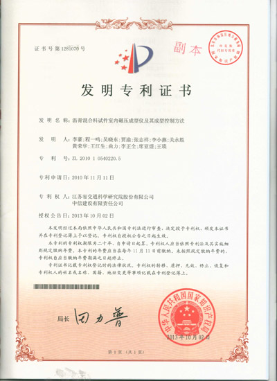 日前,由我公司自主研发的“沥青混合料试件室内碾压成型仪及其成型控制方法”通过国家知识产权局审查,被授予国家发明专利证书。  沥青混合料试件室内碾压成型仪是一种能够较好模拟沥青路面现场施工实况的车辙模拟试验设备。该设备能够较好地模拟汽车荷载的作用效果,从而经济、迅速地预估和评价沥青混合料的抗车辙性能。  沥青混合料试件室内碾压成型仪改变了传统车辙...